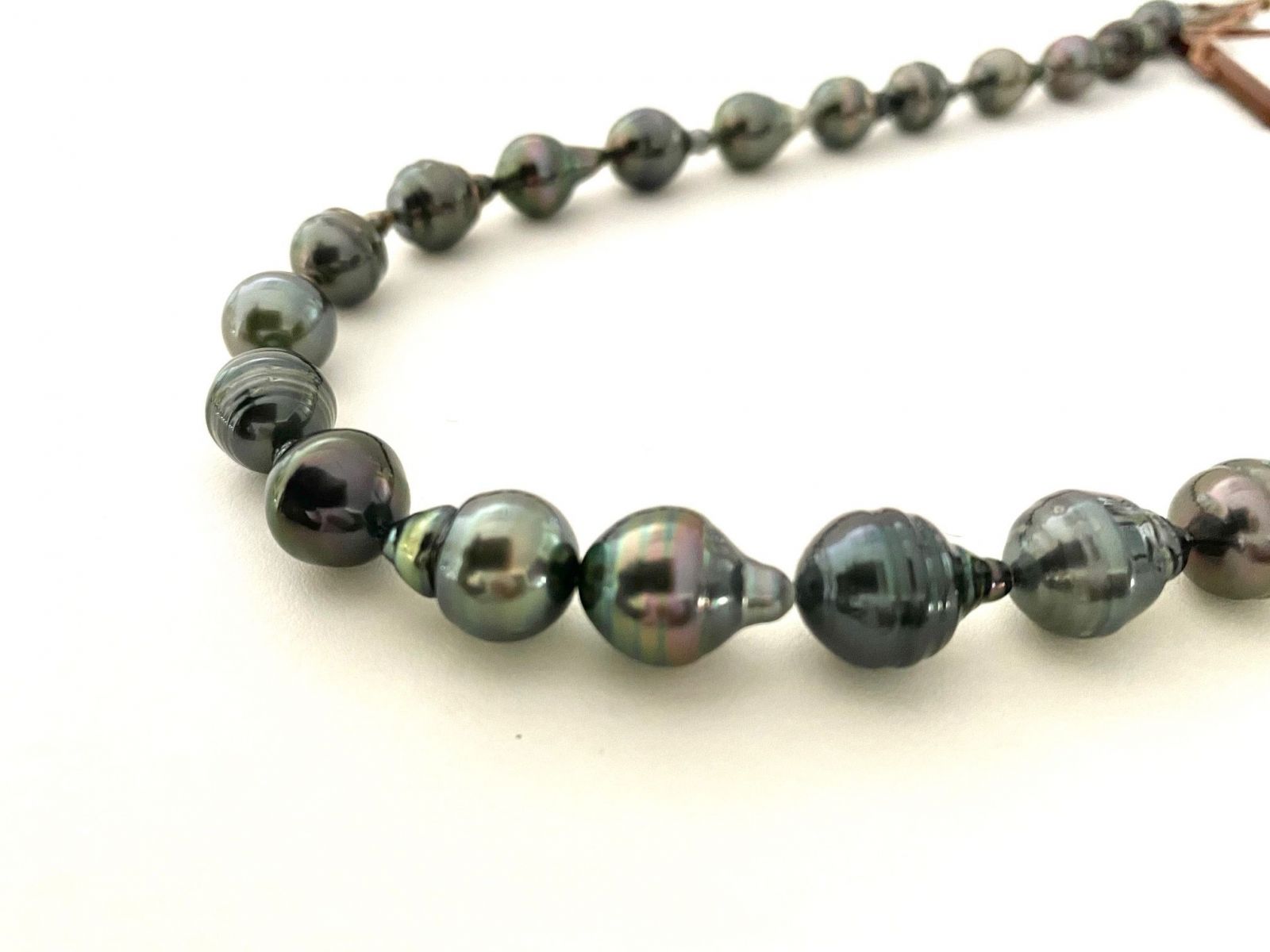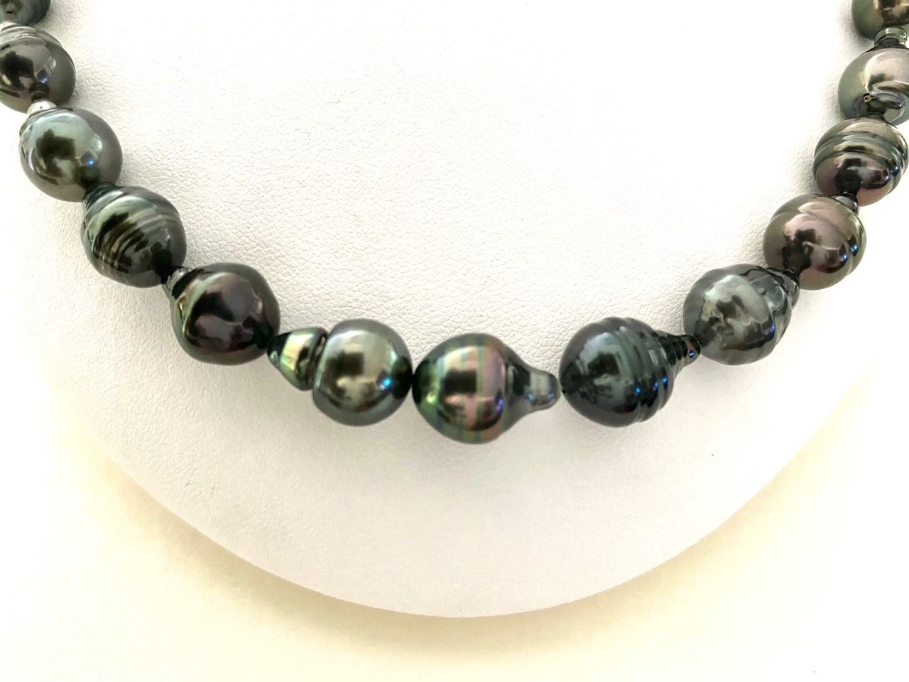 黒蝶真珠8.8mm-10.6mmパールネックレスです。天然黒蝶真珠のドロップ型でブラックグリーンの色、てりの綺麗なパールです。