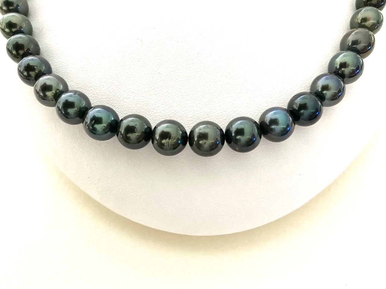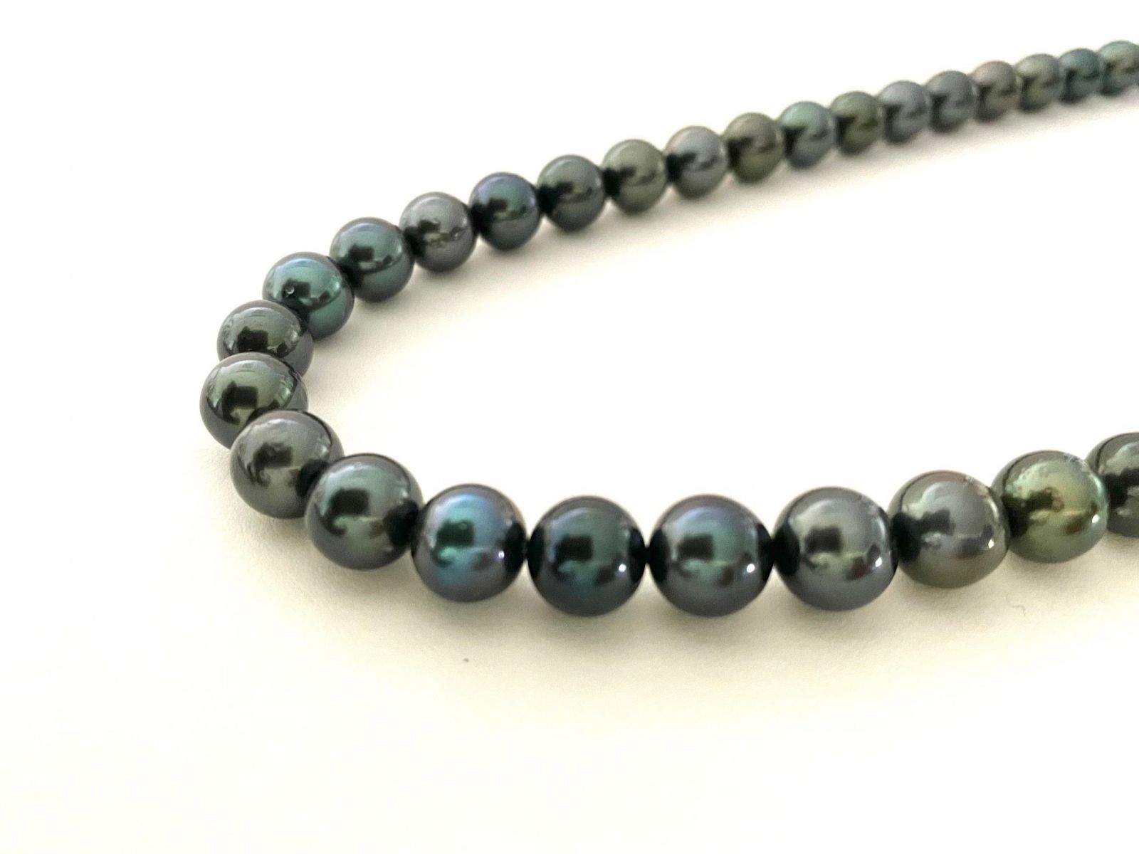 この商品の一番の特徴はその大きさにあります。8.1mm~8.9mmとその大きいのが特徴の一つでもある黒蝶真珠にしてはとても小粒な珠で組まれていて大きさも均一のストレート連になっています。ご高齢のお客様や、喪の席でなるべく目立たない印象を演出したいというお客様に大変人気がある商品です。小粒の黒蝶真珠があまり流通量が多くないのも事実で、いざ探してみるとなかなか見つからないのもこのサイズのネックレス です。エムズではお客様のご要望にお応えできるように日ごろから小粒の黒蝶真珠ネックレス も何点か在庫をしておりますので、ぜひお問い合わせください。