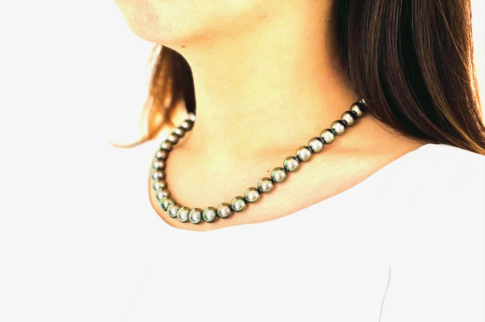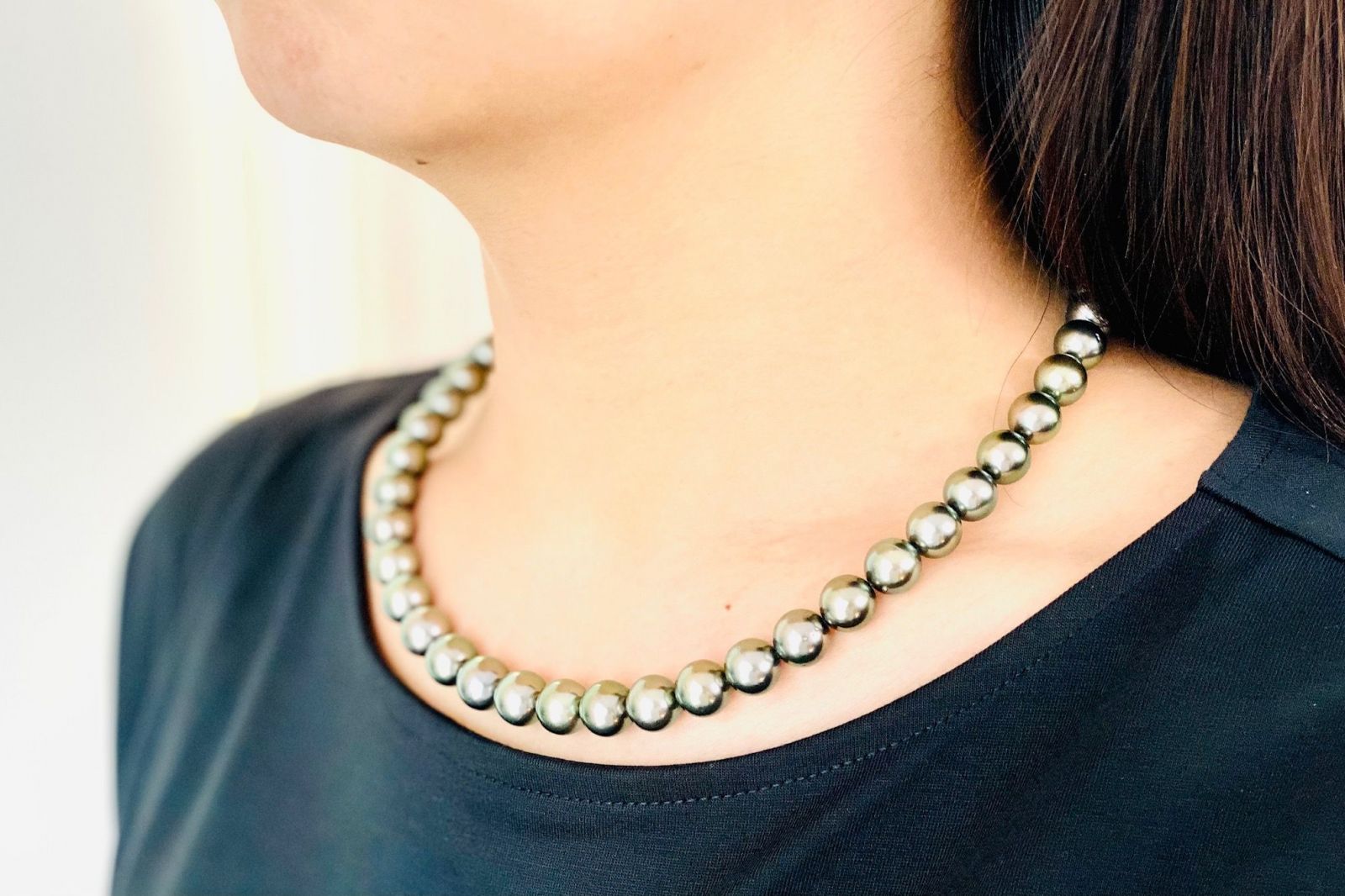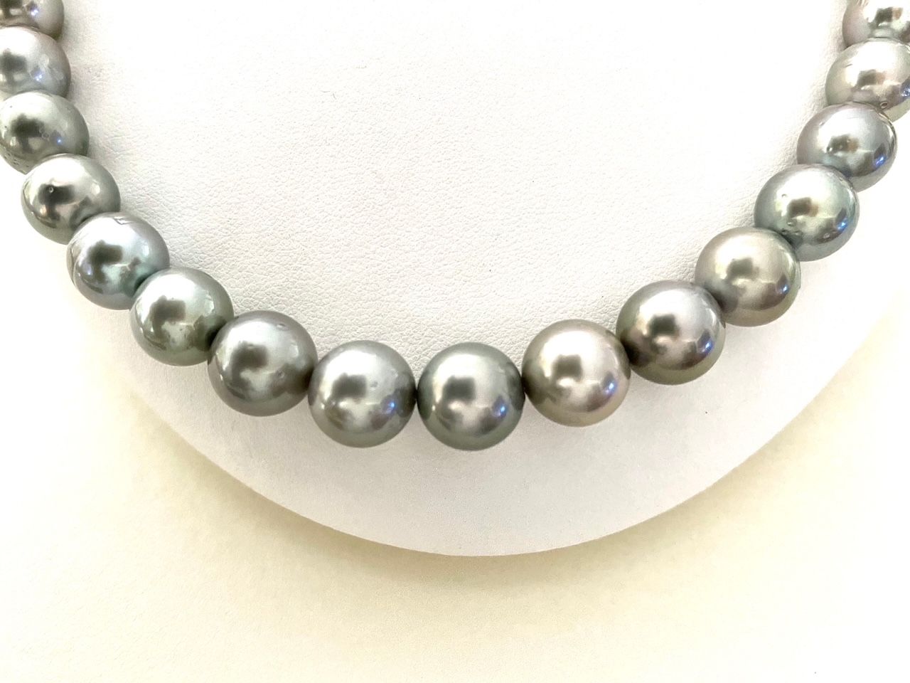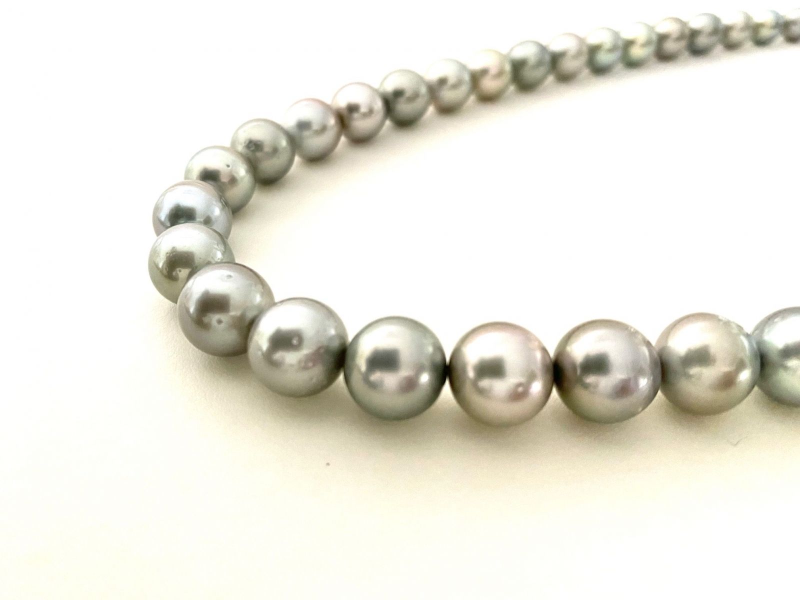 グレー系の黒蝶真珠ネックレス の紹介です。黒蝶真珠というと真っ黒いパールをイメージされるお客様もいらっしゃいますが、写真のような明るいグレー系もポピュラーなカラーでオーシャンブルーと呼ばれたりもしています。8.0mm~10.9mmのこちらの商品はテリもよく形もラウンド系でえくぼ、キズもそれほど多くない大変バランスの良いネックレス でございます。ブラック系の黒蝶真珠ネックレス は晴れの席にはあまり向かないというイメージがございますが、こちらのように明るいグレー系のネックレス でしたら晴れの席から喪の席まであらゆるシーンに幅広く使っていただけると思います。