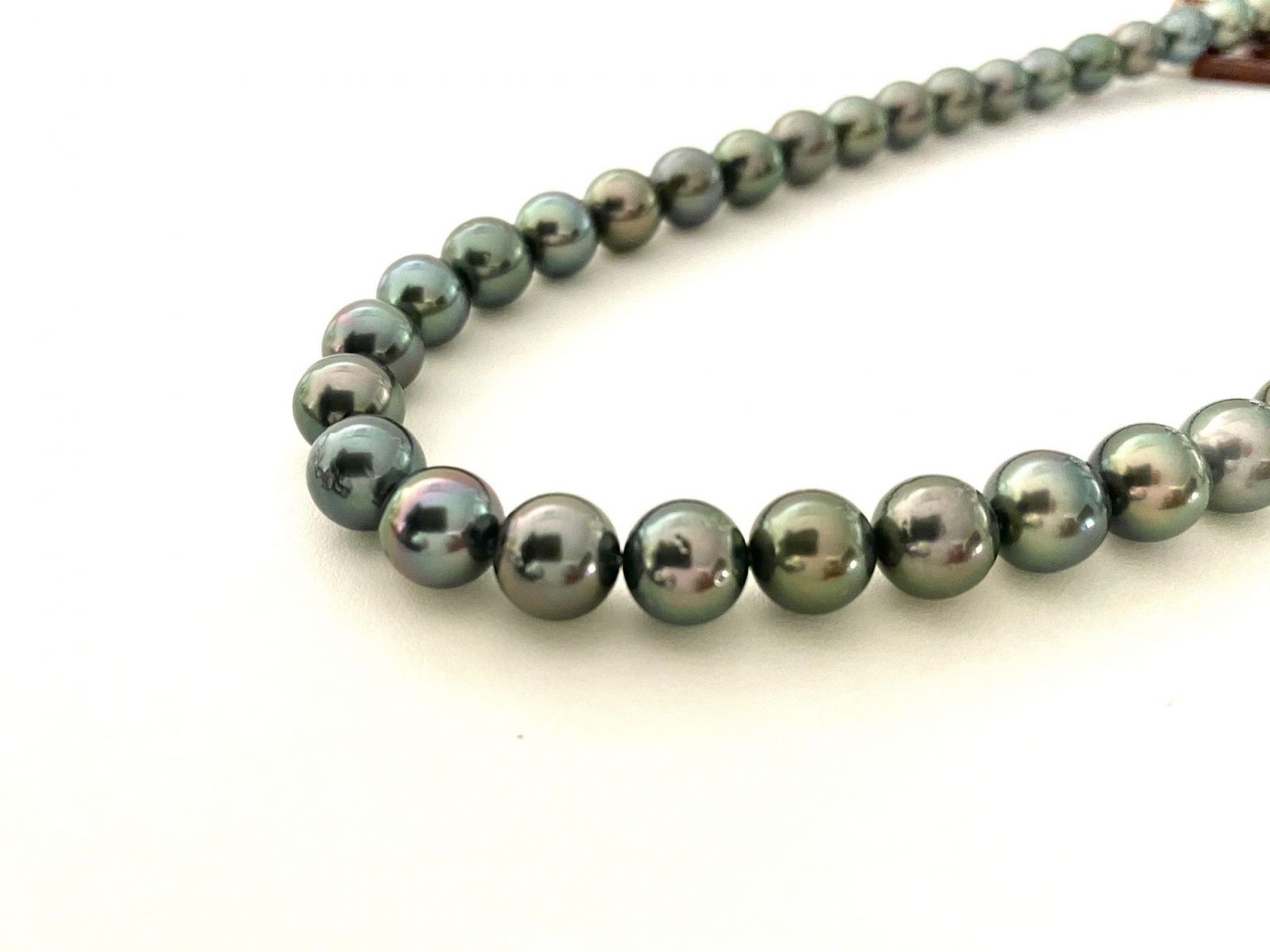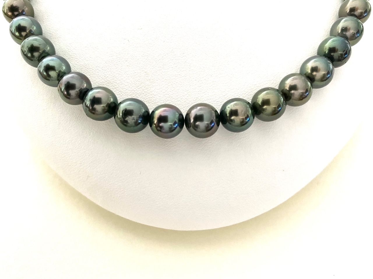 深いグリーンカラーの輝きの良い黒蝶真珠ネックレス です。色の揃いもよく黒蝶真珠にしてはキズ、えくぼも少なめでとても連相の良いネックレス です。